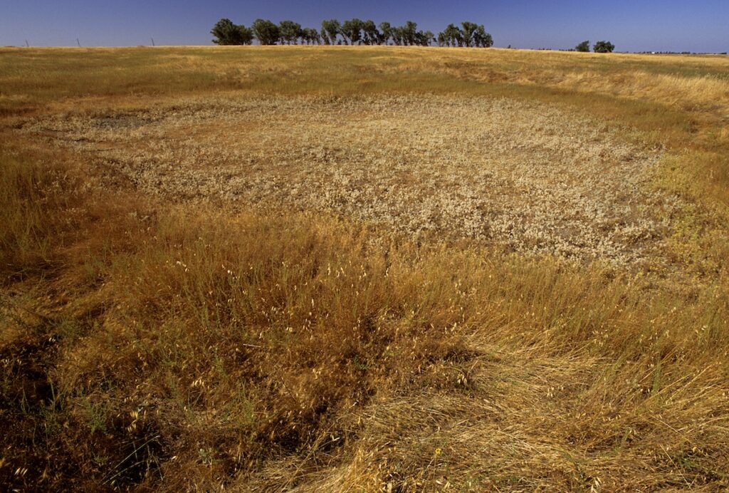 Vernal pools are temporary wetlands that fill up with winter rains. The pools have a layer of hardpan in the soil that prevents the water from soaking through. So, the water stays perched atop the hardpan and is visible in the shallow vernal pool depressions.